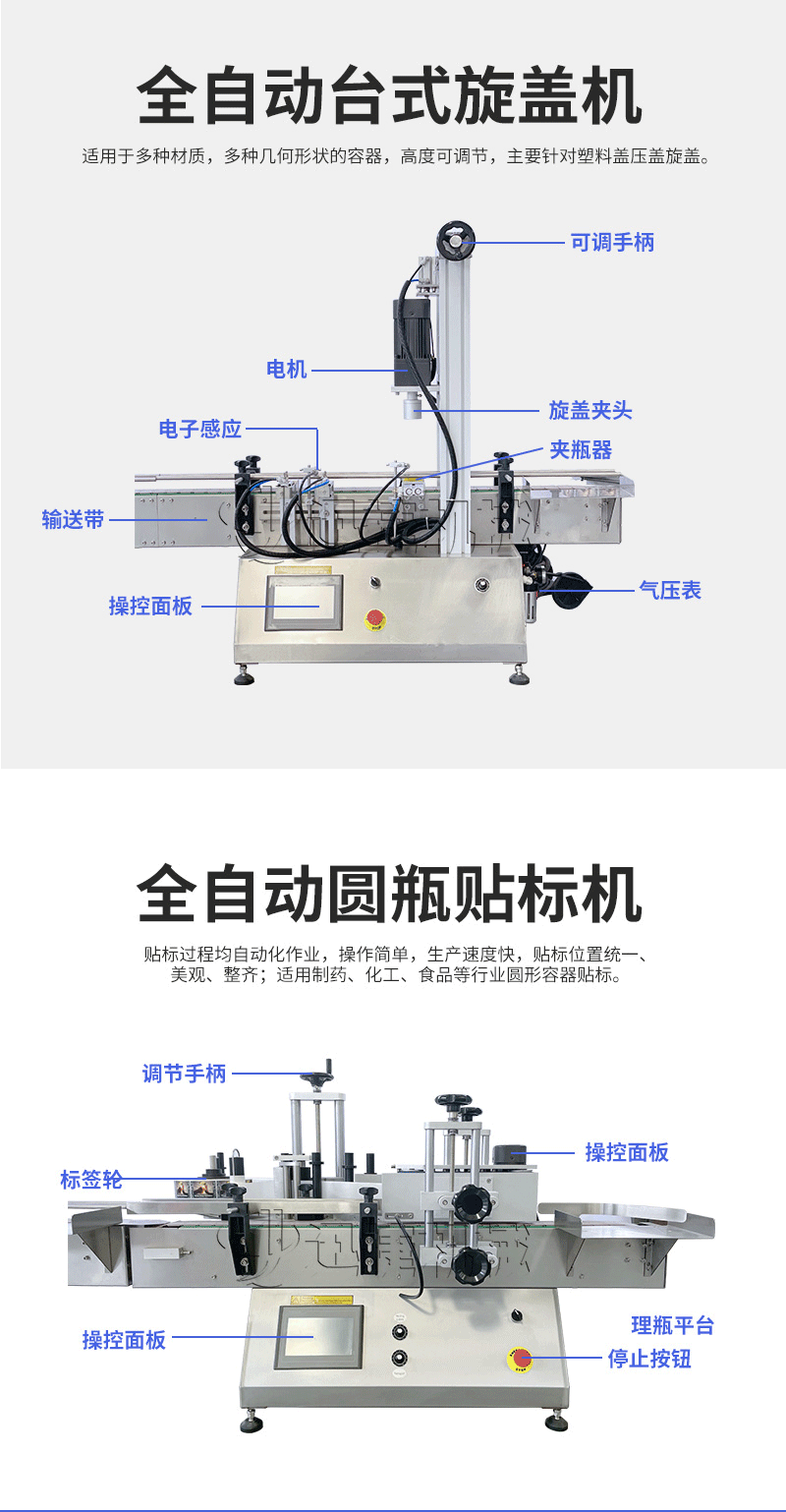 本設(shè)備主要適用于食品、日?;?、農(nóng)藥、醫(yī)藥和特殊行業(yè)。灌裝精度將受氣壓的穩(wěn)定性、物料的均勻性、灌裝速度等的影響。 產(chǎn)品說明:生產(chǎn)線根據(jù)灌裝范圍選擇型號,灌裝部分為雙頭下潛式灌裝機(jī),適用于不同物料不同瓶子的灌裝,配備自動壓蓋機(jī)和圓瓶貼標(biāo)機(jī),可實(shí)現(xiàn)不同蓋子的旋蓋貼標(biāo)工作。