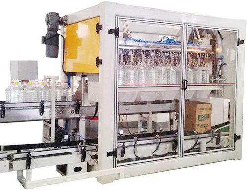 該款全自動裝箱封箱機根據(jù)客戶包裝要求, 對產(chǎn)品進料進行準確分道分組,同時由吸送紙板機構(gòu)將包裝用紙箱同步送至固定位置,再由氣動部分將分組好的產(chǎn)品推進紙箱位置,由成型折疊機構(gòu)和噴膠粘合裝置協(xié)調(diào)工作來完成產(chǎn)品的終完整紙箱包裝;各個部分的同步是由數(shù)臺伺服電機及機械調(diào)整同步來完成,以保證每組產(chǎn)品包裝的準確、合格、美觀。