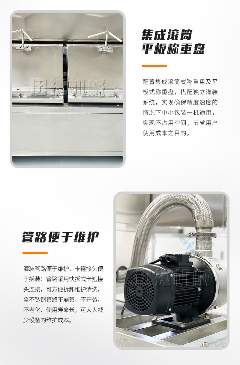 5.集成滾筒、平板稱(chēng)重盤(pán),一機(jī)多用,方便快捷:配置集成滾筒式稱(chēng)重盤(pán)及平板式稱(chēng)重盤(pán),搭配獨(dú)立灌裝系統(tǒng),實(shí)現(xiàn)確保精度速度的情況下中小包裝一機(jī)通用,實(shí)現(xiàn)不占用空間,節(jié)省用戶(hù)使用成本之目的。